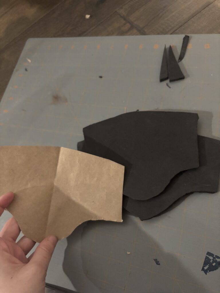 I patterned the armor with brown paper before testing it on a thicker foam than I intend to use for the final product. It took a lot of editing to get the curve to look right on my arm when taking into account the thickness of the foam