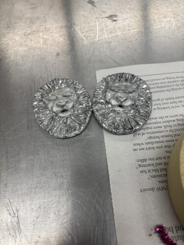 I messed with what to use for the rivets at the bottom, originally I planned to use either silver half rounds or metal pushpins. Instead I went with other pins that had a specific shape that are a better size. I also began to paper mache the silver part ontop using pipe cleaners as a base. I also added hot glue to the lion foam bases I’d made prior.