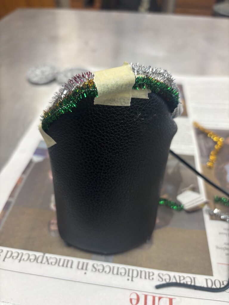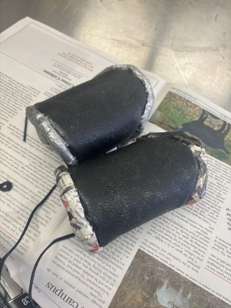 I finished the paper mache on one of the wrist cuffs and painted it black, I began the paper mache on the second wrist cuff. Throughout the process I experimented with different methods on how to paper mache that shape with little structure underneath. I struggled to get it the right size and shape. I also redid the lions using a template for the foam and then hot glue for depth, and painted them black to help add depth underneath the silver paint. I originally planned to have the paper mache cover part of the leather cuff, however while working on it I realized it wouldn’t look right proportionally compared to the design, so I pivoted to keeping it on top.